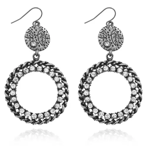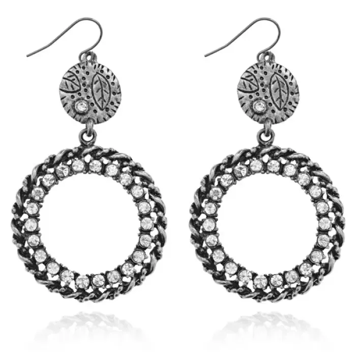 Серьги из бижутерного сплава с дизайном в виде кольца и листьев, серебристого цвета.