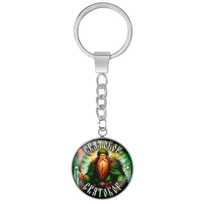 Брелок-амулет из нержавеющей стали с изображением Святобора под стеклянной линзой.