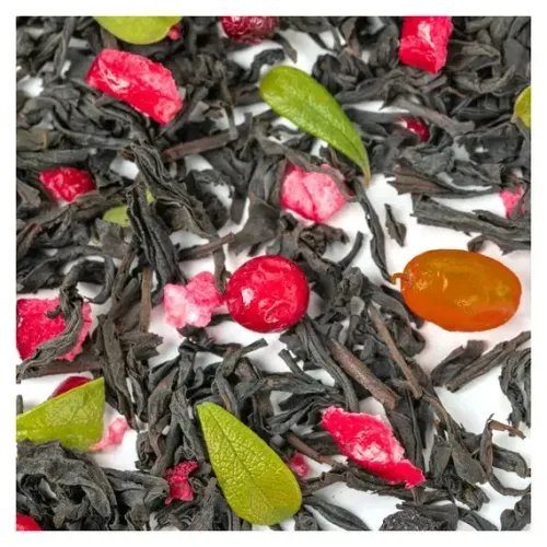 Состав: чёрный индийский чай, плоды аронии, ягоды морошки, листья брусники, ягоды брусники, ягоды облепихи, кусочки клюквы, ягоды черники, ароматизатор «Лесные ягоды».