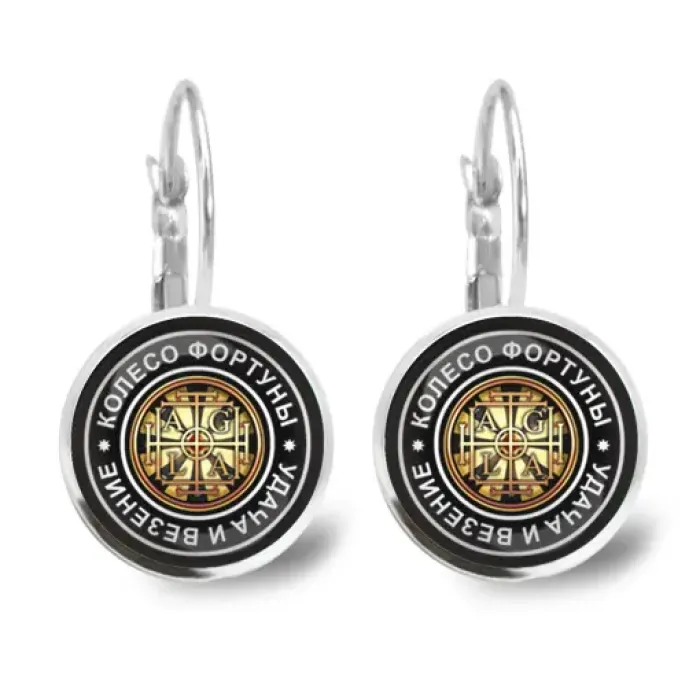 Серьги с изображением колеса фортуны под выпуклыми стеклянными линзами.