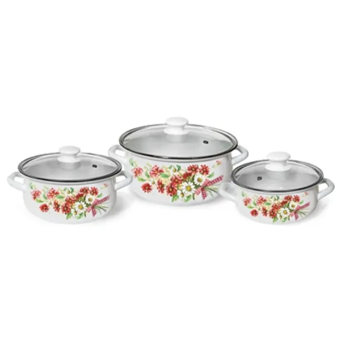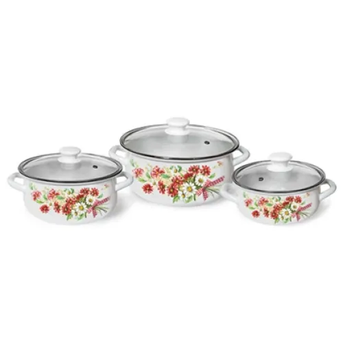 - Материал: сталь с эмалированным покрытием- Количество предметов в наборе: 3 кастрюли- Объём: 2 л, 3 л, 4 л- Совместимость: все типы плит, включая индукционные- Особенности ухода: гладкая поверхность облегчает очистку