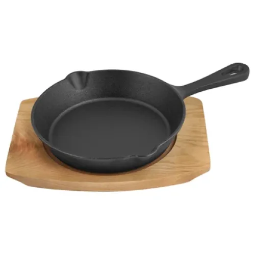 Сковорода изготовлена из чугуна, материала с высокой теплоёмкостью, что способствует равномерному распределению и длительному сохранению тепла. Деревянная подставка служит для защиты поверхности стола от нагретого дна сковороды и выполняет декоративную функцию при сервировке.