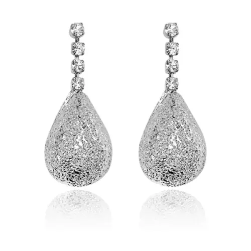 Серьги-пусеты из бижутерного сплава в форме капли серебристого цвета со стразами.
