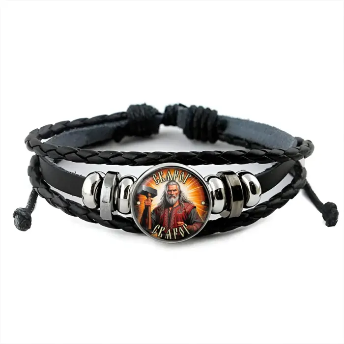 Брелок-амулет с изображением славянского бога Сварога. Изготовлен из синтетической кожи, металла и стекла. Изображение диаметром 20 мм расположено под выпуклой стеклянной линзой.