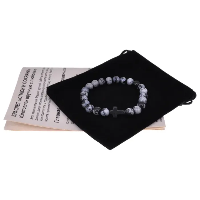 Христианский браслет Крест с нат.камнем Снежный обсидиан 8мм BSH-12-14