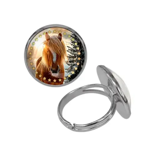 Металлическое кольцо с символикой года Лошади. Изделие украшено стеклянной линзой и имеет безразмерную форму.