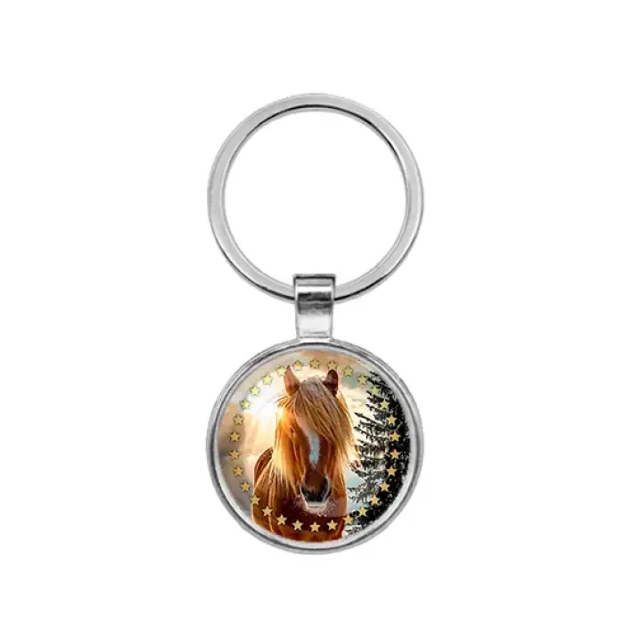 Брелок круглой формы с изображением символа года Лошади. Изготовлен из бижутерного сплава и стекла.