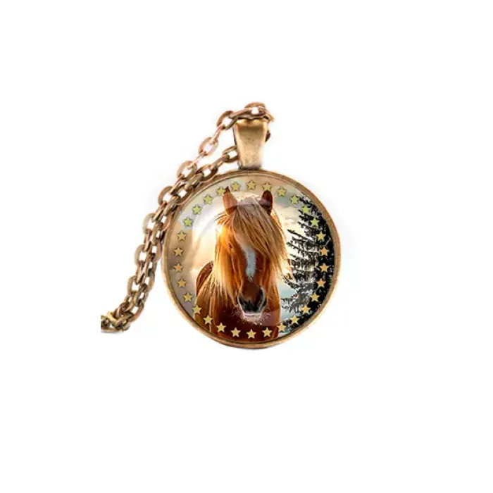 Сувенирный кулон «Год Лошади» из бижутерного сплава с бронзовым покрытием и стеклянной линзой.