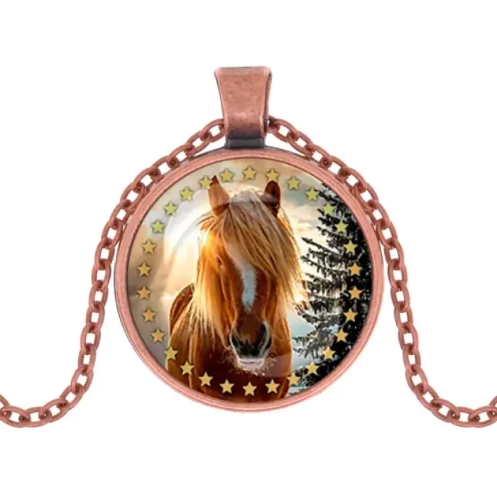Кулон с цепочкой, посвящённый Году Лошади. Изготовлен из бижутерного сплава с покрытием под медь и стекла.