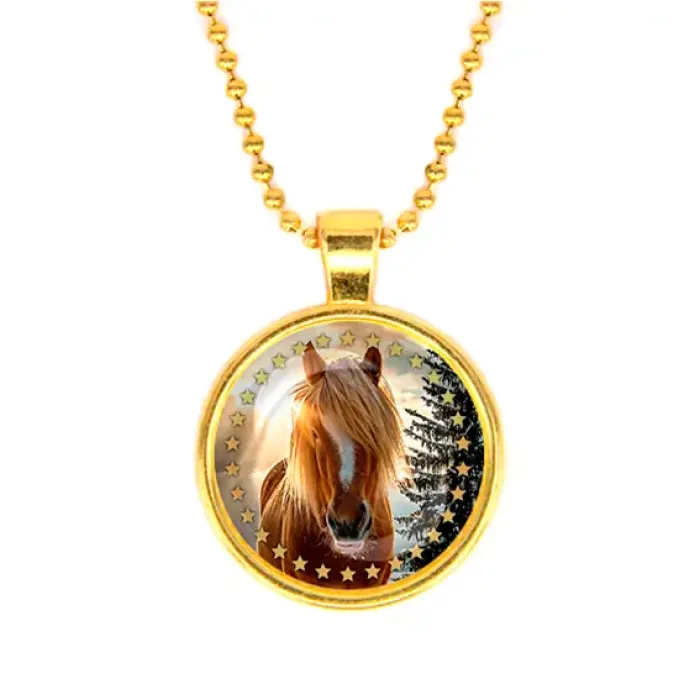 Кулон с цепочкой, посвящённый году Лошади. Изготовлен из бижутерного сплава с золотым покрытием и стеклянной линзой.