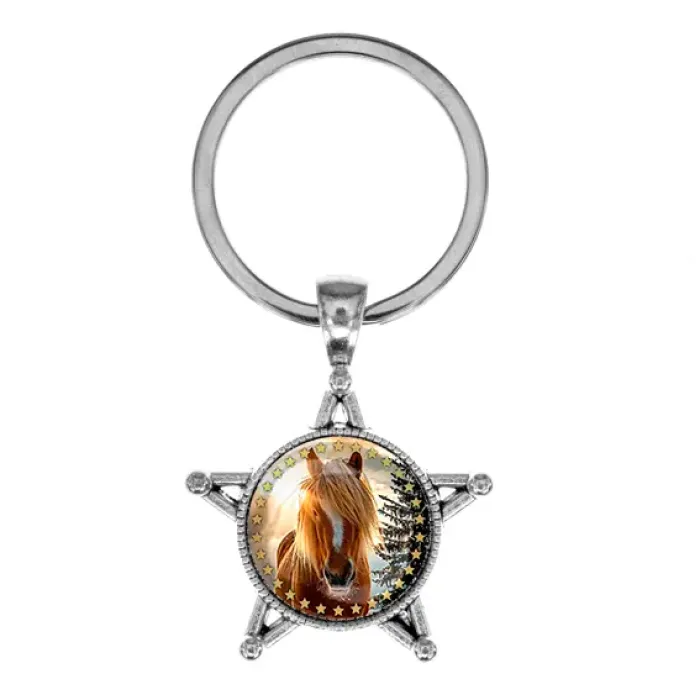 Брелок в виде звезды с символикой Года Лошади. Материал — бижутерный сплав под серебро и стекло.
