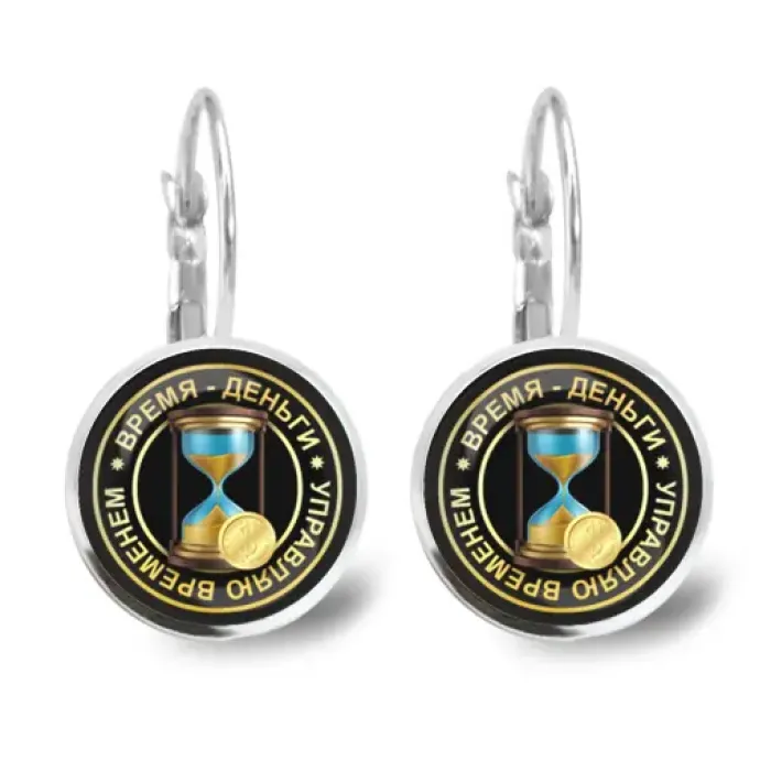 Серьги из бижутерного сплава с изображениями под выпуклыми стеклянными линзами.
