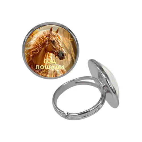 Безразмерное кольцо из бижутерного сплава с символикой года Лошади и выпуклой стеклянной линзой.