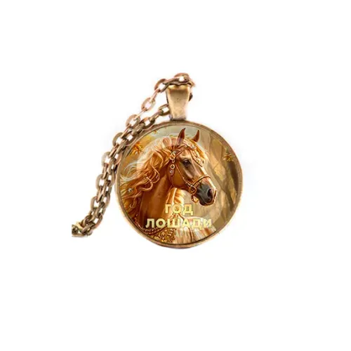 Кулон с символикой Года Лошади из бижутерного сплава с бронзовым покрытием и стеклянной линзой.