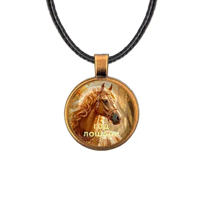 Кулон «Год Лошади» из бижутерного сплава с бронзовым покрытием и стеклянной линзой.