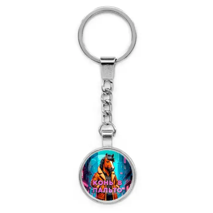Круглый брелок из бижутерного сплава с изображением «Конь в пальто» под выпуклым стеклом.