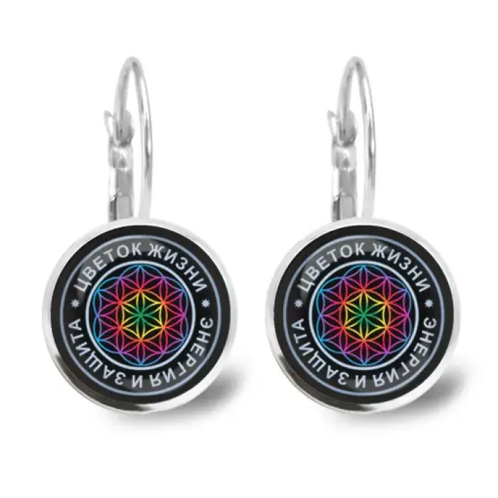 Серьги с символом Цветок жизни. Изображения диаметром 18 мм расположены под выпуклыми стеклянными линзами.