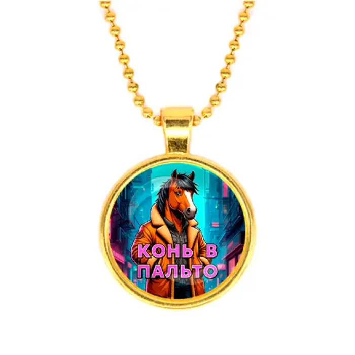 Кулон из бижутерного сплава с золотым покрытием и стеклянной линзой, с изображением «Конь в пальто».