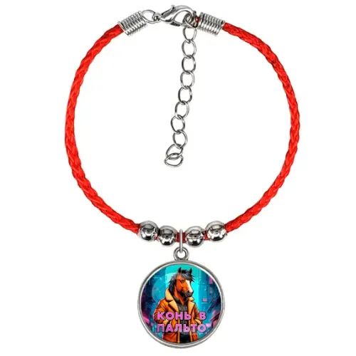 Браслет из красного шнура — это стильный аксессуар с изображением коня в пальто, защищенным выпуклым стеклом. Он станет не только модным дополнением к образу, но и символом удачи и благополучия.