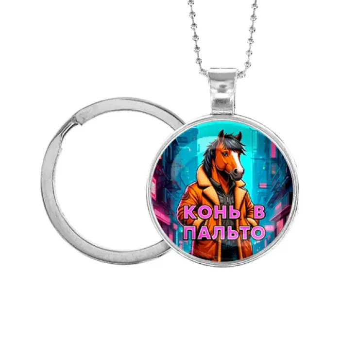 Кулон-брелок «Конь в пальто» из бижутерного сплава с покрытием под серебро и защитной стеклянной линзой.
