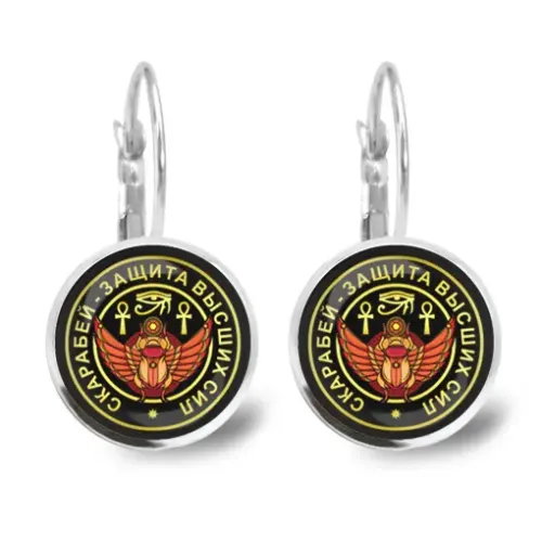 Серьги-сувенир из бижутерного сплава с изображением скарабея под стеклянной линзой.