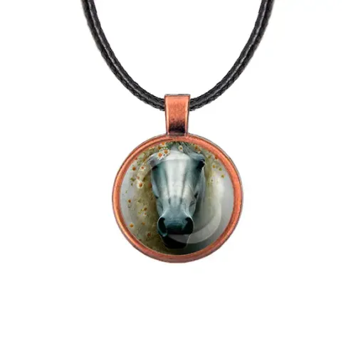 Кулон из бижутерного сплава с изображением лошадки в тумане под выпуклой стеклянной линзой.