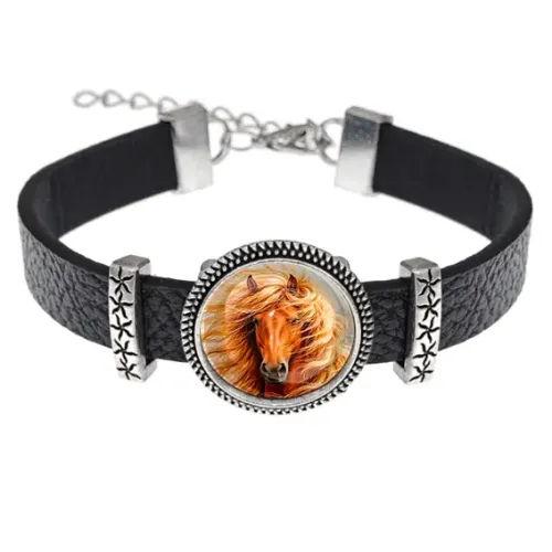 Кожаный браслет с декоративным элементом в виде лошади под стеклянной линзой.