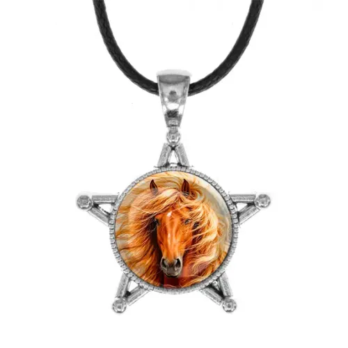 Кулон в виде звезды с изображением лошади, выполненный из бижутерного сплава и стекла.