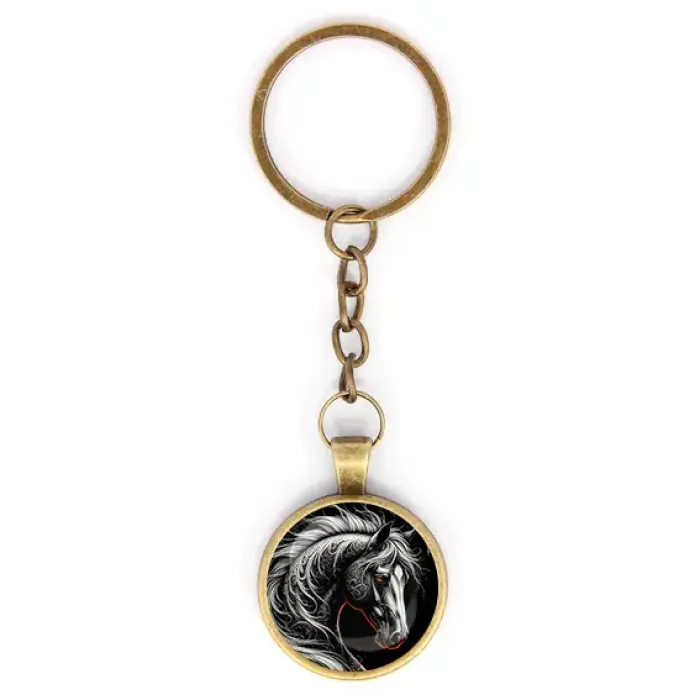Круглый брелок с изображением лошади из бижутерного сплава с бронзовым покрытием и стеклянной линзой.