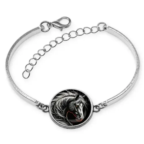 Металлический браслет с изображением лошади. Изготовлен из бижутерного сплава с серебряным покрытием, имеет выпуклую стеклянную линзу.