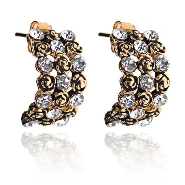 Серьги-пусеты из бижутерного сплава в форме розы с декоративными стразами.
