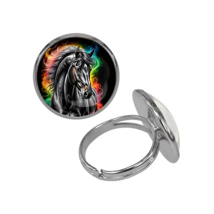 Металлическое кольцо с изображением черного коня под выпуклой стеклянной линзой.