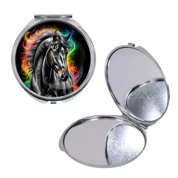 Это зеркало с принтом «Черный конь» станет отличным подарком или дополнением к личной коллекции аксессуаров.