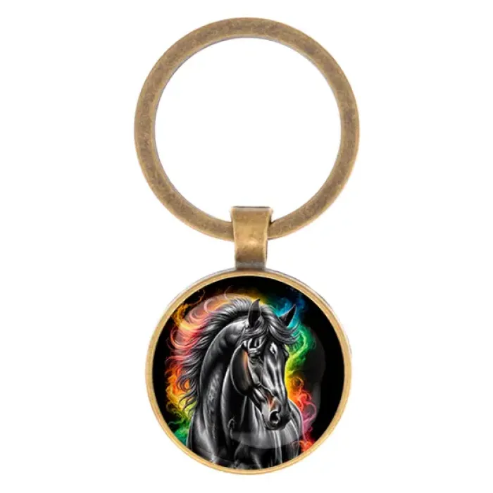 Круглый брелок для ключей из бижутерного сплава с изображением черного коня.