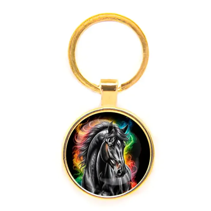 Круглый брелок из бижутерного сплава с изображением черного коня под выпуклой стеклянной линзой.