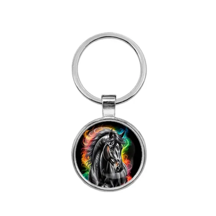 Брелок круглой формы из бижутерного сплава с изображением черного коня под выпуклым стеклом.