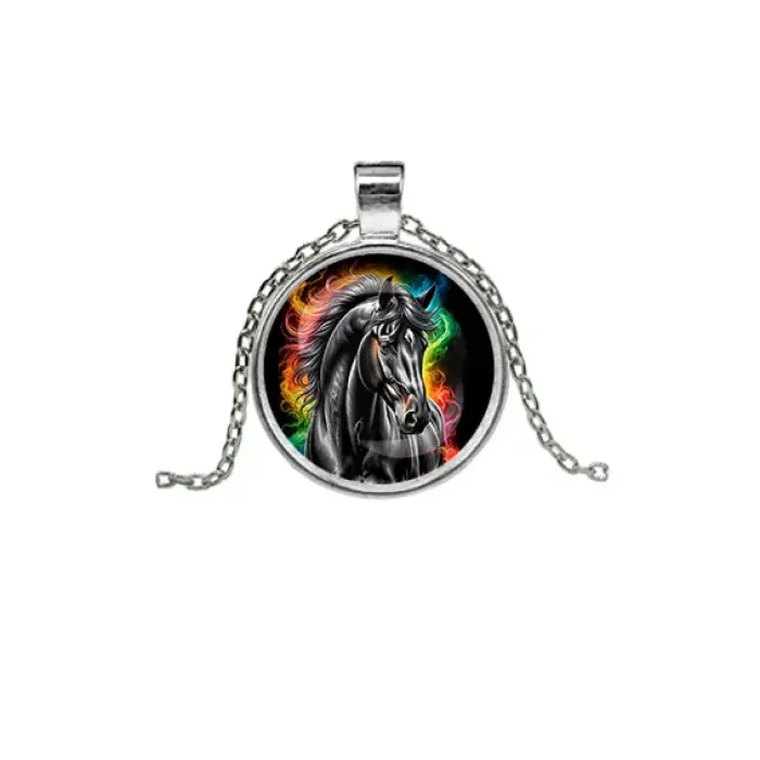 Кулон из бижутерного сплава с изображением черного коня под выпуклым стеклом.