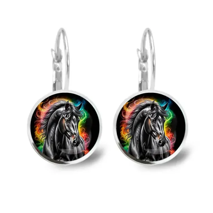Серьги для ношения. Бижутерный сплав с покрытием под серебро, дизайн с изображением черного коня и выпуклыми стеклянными линзами.