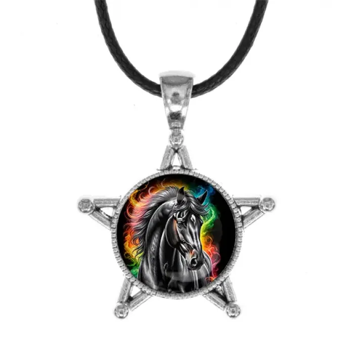 Сувенирный кулон в виде звезды из бижутерного сплава с изображением черного коня под стеклянной линзой.