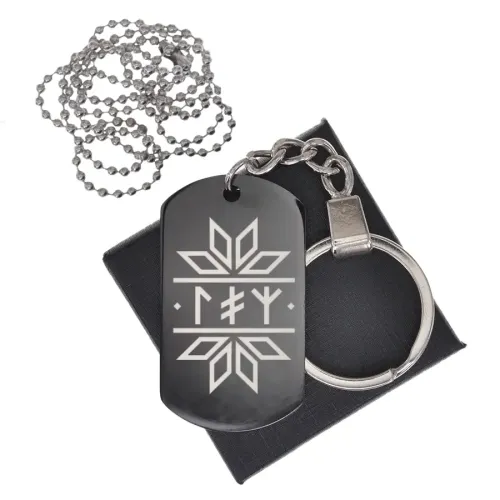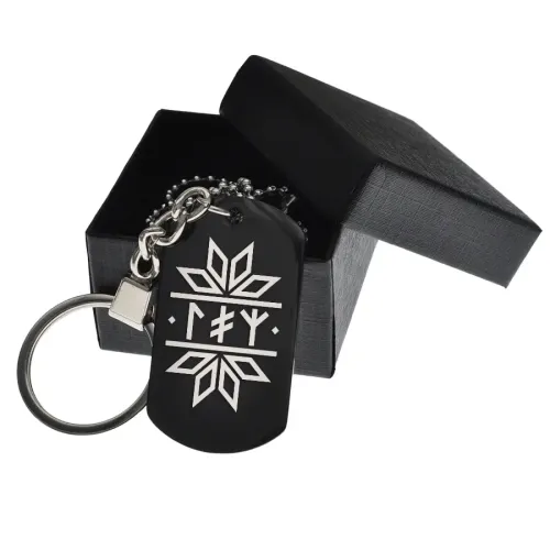 Черный жетон со славянской рунической формулой. Изготовлен из нержавеющей стали с чернением и лазерной гравировкой.
