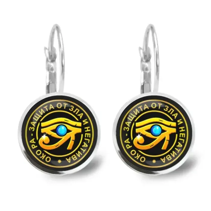Серьги с символикой Око Ра. Изготовлены из бижутерного сплава со стеклянными линзами и замком типа левербэк.