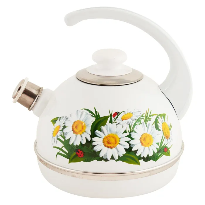 Эмалированный чайник объёмом 3,5 литра предназначен для кипячения воды на плите. Модель оснащена консольной ручкой и свистком для сигнала о закипании. Выполнен в белом цвете с декором «Марианна» и имеет ободок из нержавеющей стали.