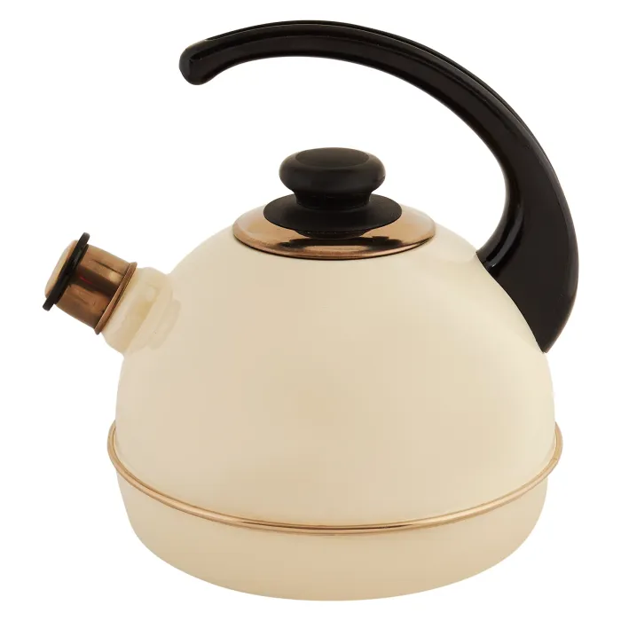 Корпус чайника изготовлен из стали с эмалевым покрытием, которое обеспечивает защиту от коррозии и упрощает очистку. Консольная ручка закреплена на корпусе, что способствует безопасному и удобному использованию при переноске и наливании кипятка. Декоративные элементы выполнены из нержавеющей стали с золотистым покрытием.