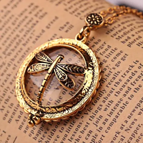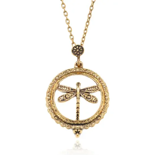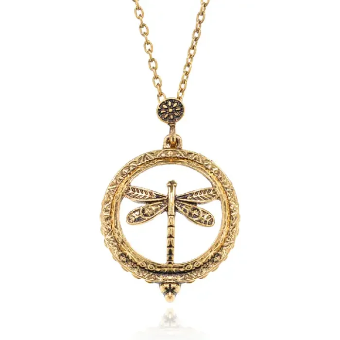 Кулон в виде стрекозы из бижутерного сплава со стеклянной вставкой и цепочкой.