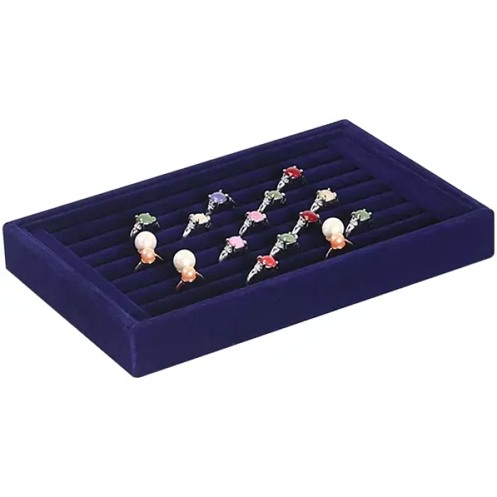 Дисплей для колец синего цвета, обит искусственным бархатом.