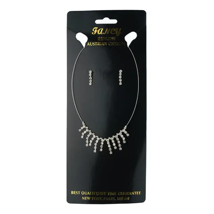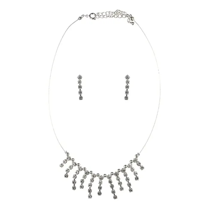 Комплект бижутерии включает колье и серьги из сплава с покрытием под серебро и вставками из страз.