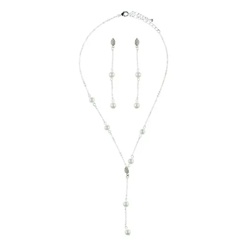 Материал и изготовление: Бижутерный сплав с покрытием под серебро. Вставки из искусственного жемчуга и страз. Кулон с замком типа лобстер, серьги с замком-пусет.