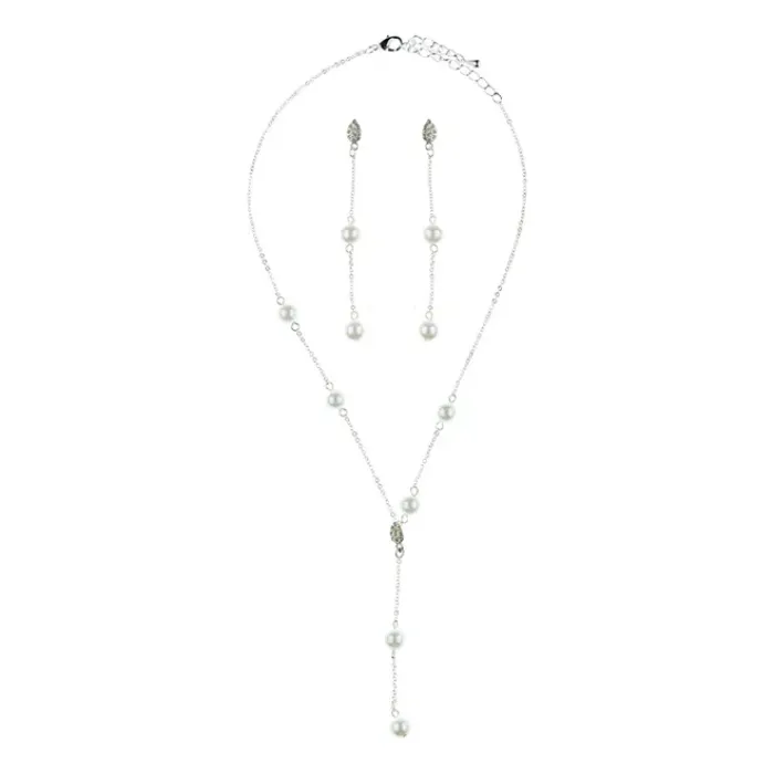 Комплект бижутерии включает кулон и серьги с искусственным жемчугом и стразами.
