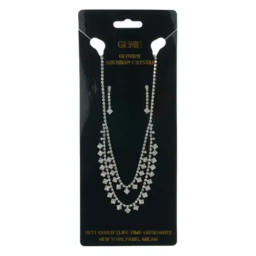 Комплект бижутерных украшений, состоящий из колье и серёг, выполнен из сплава с покрытием под серебро и декорирован стразами.