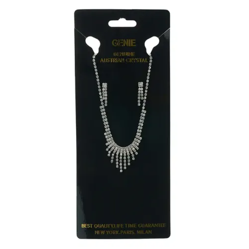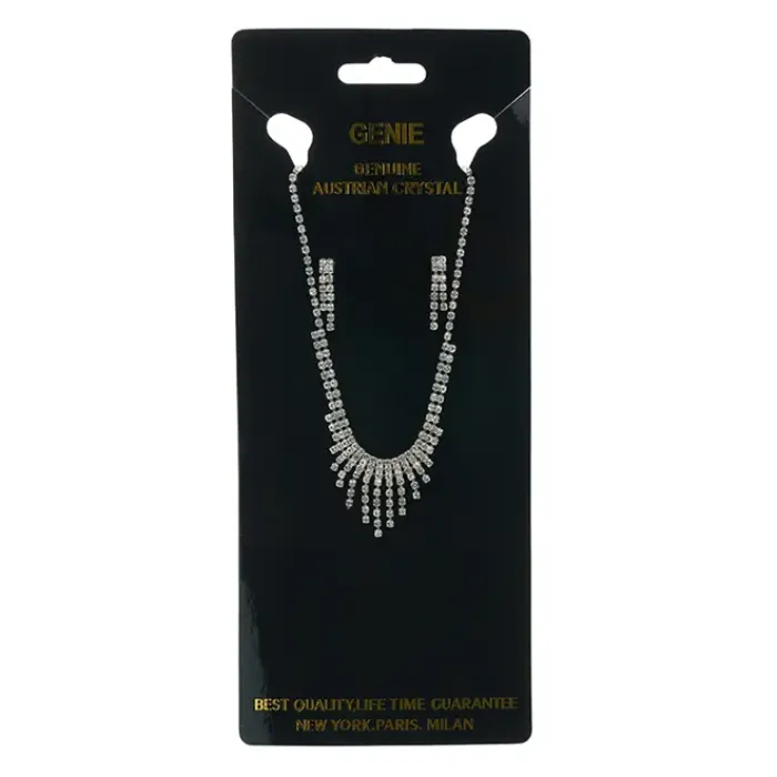 Комплект бижутерии, состоящий из колье и серёг-пусет, с вставками из страз и покрытием под серебро.